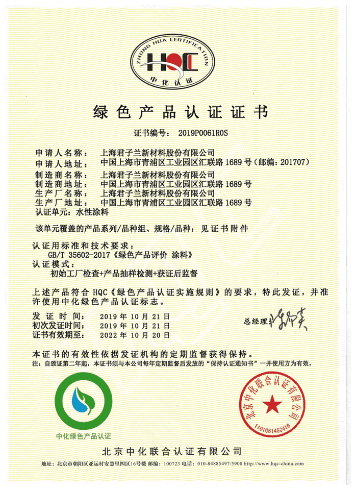 坚持环保发展理念:君子兰漆获【绿色产品认证 】2019年11月,经过专家组的严格评审,君子兰涂料集团的水性涂料、辐射固化涂料(含水性UV)已经顺利通过绿色产品认证。2019年11月30日