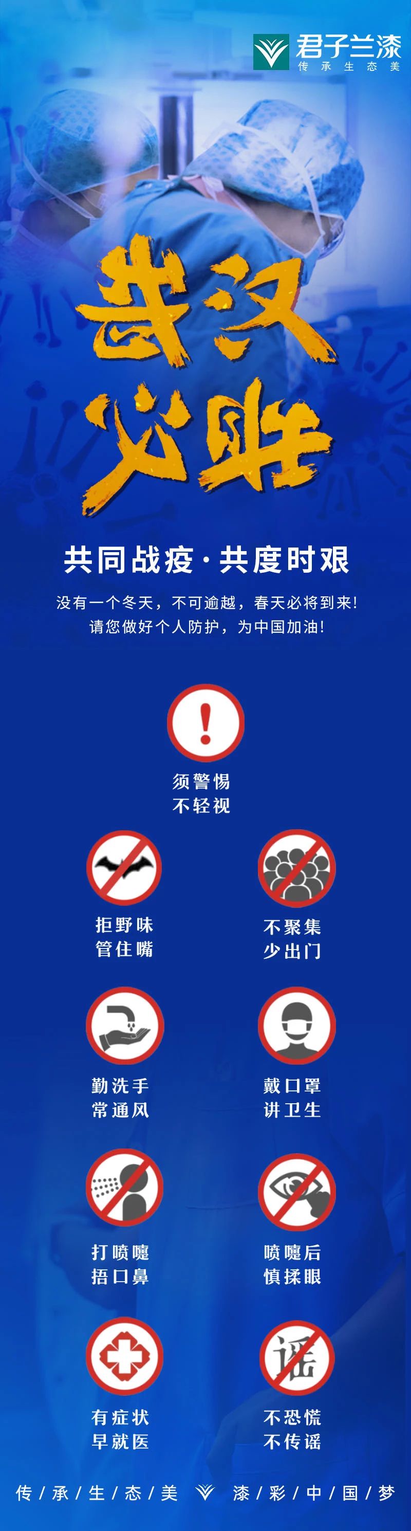 共克时艰,我们一同战“疫”2020的春节,必将是一个历史铭记的时刻,新冠肺炎疫情引发全国14亿人民的关注。大事难事见担当,危难时刻显作为。过去的时间里,君子兰人迅速行动起来,以健康安全作为工作的重中之重,以实际行动全力支持配合社会各界打好疫情防控攻坚战2020年03月23日